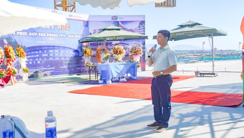 Anh Lê Hồng Lĩnh – Giám đốc FSoft Miền Trung, CĐT dự án FPT Conplex FC3 – phát biểu chúc mừng và gửi lời cảm ơn đến nhà thầu chính, đơn vị TVGS và BCH công trường tham gia thi công dự án