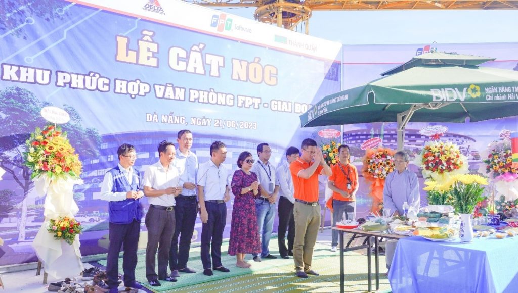 Đại diện CĐT FSoft, Nhà thầu chính Thành Quân, đơn vị TVGS Delta cùng tham gia lễ cúng cất nóc Dự án FPT Complex giai đoạn 3 sáng ngày 21/6/2023