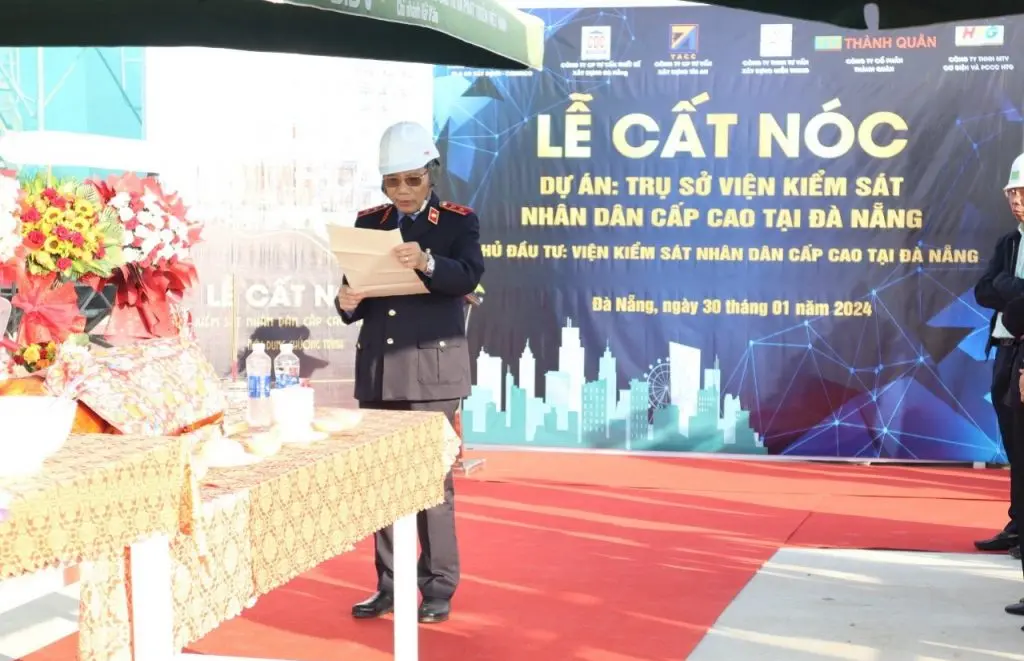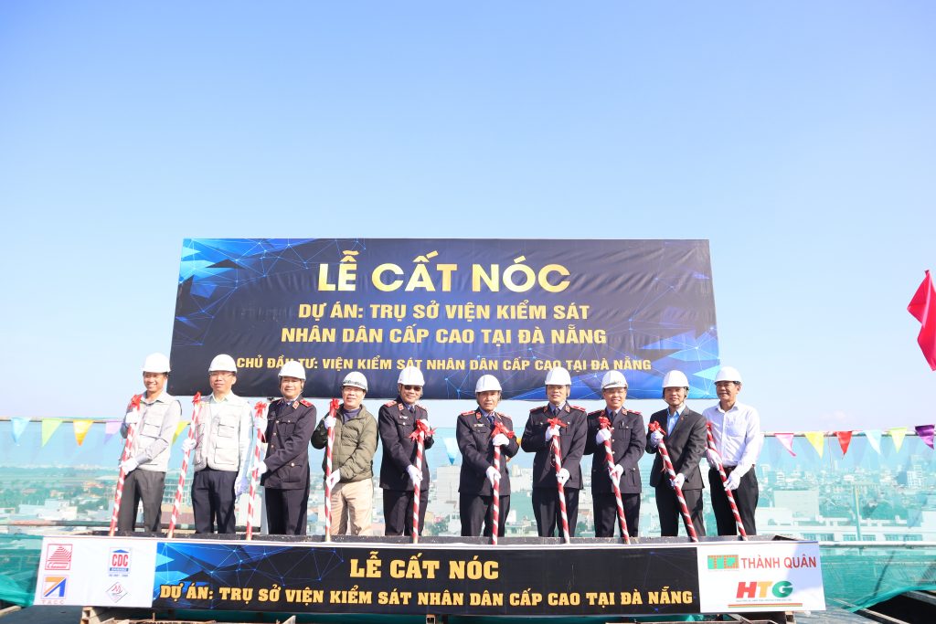 Lễ cất nóc Dự án Viện Kiểm Sát Nhân dân cấp cao tại Đà Nẵng được nhà thầu chính – liên danh Công ty CP Thành Quân – HTG phối hợp với chủ đầu tư (CĐT) dự án – Viện kiểm sát nhân dân cấp cao tại Đà Nẵng và đơn vị tư vấn QLDA – Công ty Coninco, TVGS – Liên doanh Công ty TNHH Tư Vấn Xây Dựng Miền Trung – Tín An, Công ty tư vấn thiết kế xây dựng CDC tổ chức ngày 30/01/2024. Sau 170 ngày đêm làm việc, với sự nỗ lực tối đa của nhà thầu chính cùng sự hỗ trợ của BQLDA, Liên danh TVGS và đặc biệt là sự chỉ đạo sát sao, kịp thời của CĐT – Viện kiểm sát Nhân dân cấp cao tại Đà Nẵng, dự án Xây dựng trụ sở VKS Nhân dân cấp cao đến thời điểm này đã hoàn thành phần thô, vượt hơn 1 tháng so với tiến độ được CĐT phê duyệt và chính thức Cất nóc vào sáng nay.