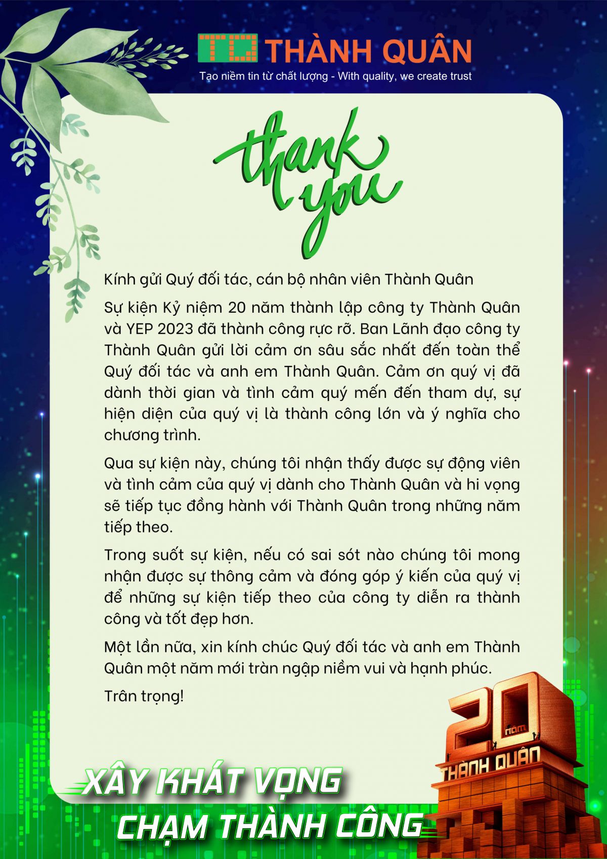 Công ty Cổ phần Thành Thành Quân xin gửi lời tri ân sâu sắc đến mọi nỗ lực và cố gắng của toàn thể cán bộ công nhân viên chức của công ty cũng như những khách hàng, những đối tác đã tin tưởng, đồng hành cùng công ty suốt chặng đường vừa qua. Nhân đây, Thành Quân cũng xin chúc tất cả quý vị lời chúc sức khỏe hạnh phúc, thành công. Chúc công ty luôn vững bước thành công và bền vững!